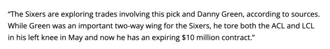 据美媒凯文-奥康纳的说法,目前76人正在探索将老将丹尼-格林和今年选秀大会第23顺位选秀权摆上货架:
