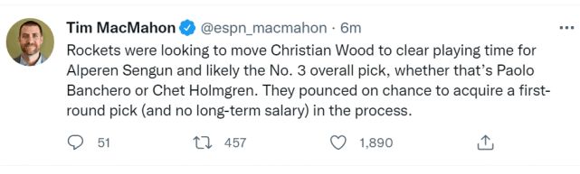 火箭为什么要交易伍德?名记Tim MacMahon报道称,火箭送走伍德,是希望为申京和未来的探花腾出上场时间。在此过程中,他们抓住机会收获一个首轮签,而且还没有换回长期合同。对于火箭来说, 这是一箭三雕的买卖。乍看一下,感觉火箭有点亏,但或许他们才是最终的赢家。