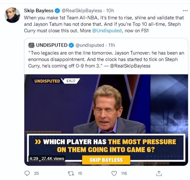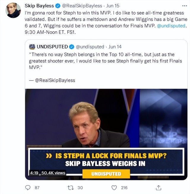 但6月15日,名嘴斯利普-贝勒斯在个人的节目中这样说道:“库里不可能成为历史前十的球员,但作为历史最伟大的投手,我希望看到他拿下一个FMVP。”