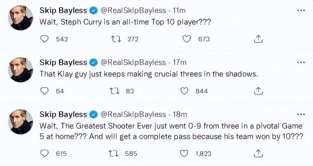 在库里G5打出22中7+三分9中0的表现后他就朝库里开炮:“就这,还历史前十?有史以来最伟大的投手在主场天王山9中0,因为他的球队赢了10分你们就轻易放过他。”他甚至还鼓励威金斯去抢库里的FMVP,如今他又连续朝库里开炮。