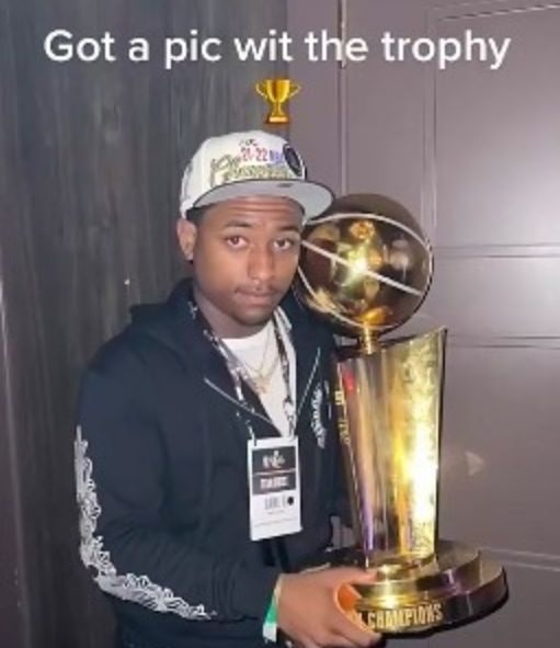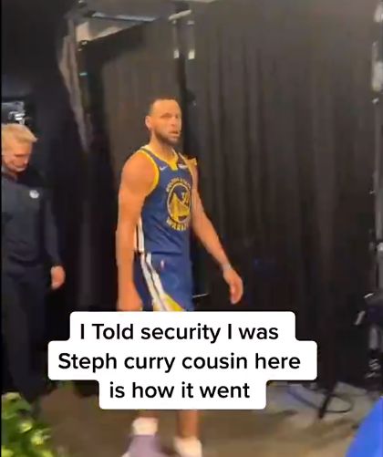 在该视频当中,其配音说道,“我跟保安人员说,我是库里的表兄,这就是事情的整个经过。我进入球员亲朋好友的专属房间,看到沮丧不已的塔图姆,我还被带到夺冠庆祝派对,与库里、追梦格林、科尔合影,还跟总冠军奖杯进行合影。”