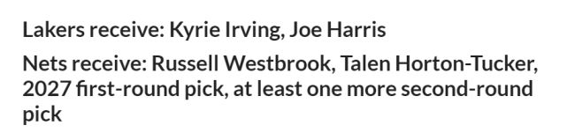 具体方案是:湖人送出威少、霍顿-塔克、2027年首轮和至少1个次轮签,得到篮网的欧文和乔-哈里斯。