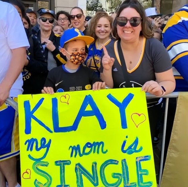 作为勇士的“颜值担当”,克莱也引起了在场不少小球迷母亲的青睐。其中有一位小男孩就拿着一张写有“克莱,我妈妈是单身”的展示牌,来给自己的母亲现场征婚。而小球迷一脸不悦,反倒是他一旁的母亲则是喜笑颜开。