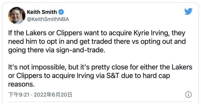 而据美媒基思-史密斯的说法,欧文转会湖人或是快船的可能性并不大: