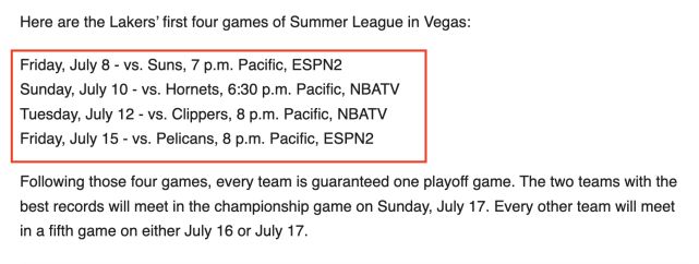 最后需要谈及的是,湖人是参加今年夏季联赛的球队之一,目前湖人在夏季联赛四场比赛的赛程已经出炉: