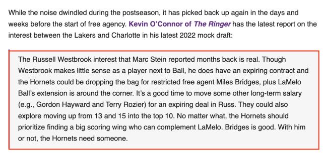 另一方面,美媒凯文-奥康纳透露湖人和黄蜂之间推动威少交易的可能性,在这份报道中,黄蜂仍对威少有一定的兴趣: