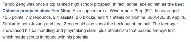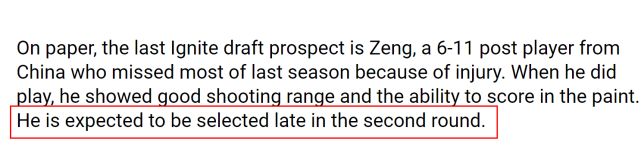谈到曾凡博时,官网写道:“曾凡博因伤缺席了上赛季的大部分比赛,他是一位身高2米11的内线球员。当他能够上场时,他展现了良好的射程和内线得分能力,预计他将在次轮末段被选中。”