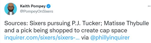 当然,等到自由球员市场开启时,一切可能会有所变化,但联盟高管普遍认为塔克非常有可能加盟76人。不过,76人并没有足够的薪金空间签下塔克。消息源透露,他们正在寻求进行一笔三方交易,可能包括23号签和塞布尔,目的是腾出薪金空间。