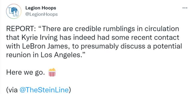 北京时间6月23日,据名记马克-斯坦恩报道,可靠消息透露,欧文近日与詹姆斯有过接触,大概是讨论了在洛杉矶重聚的可能性。而名记沃纳罗斯基报道称,湖人已经成为篮网的最大威胁,篮网害怕欧文离开后,杜兰特也会提出交易申请。
