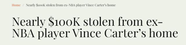 北京时间6月23日,据美媒报道,前NBA球星文斯-卡特位于亚特兰大的豪宅遭遇入室盗窃,幸好家人没有受伤,但近10万美元被盗。