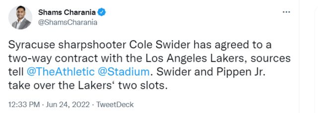 在高中最后一年,谢里夫以场均27分17篮板的两双数据带领球队成功夺冠。正当自己准备在大学联赛施展拳脚之时,却因为心脏问题被迫接受手术,大学联赛中,谢里夫并没有打出外界预期的优异表现,大学四年一共就只打了37场比赛,场均仅有2.6分3篮板的惨淡数据。此外湖人还签了射手科尔-斯威德。
