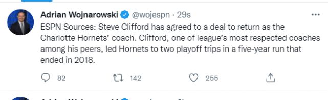 北京时间6月25日,据名记沃纳罗斯基报道,史蒂夫-克利福德已经和夏洛特黄蜂达成协议,他将重回黄蜂担任主教练。60岁的克利福德是联盟最受尊重的主教练之一,他曾在黄蜂执教5年,并两度率领黄蜂打进季后赛。