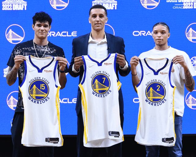 北京时间6月25日,勇士队为三名新秀召开了新闻发布会,随后,三个年轻人举着自己的球衣开心合影。28号秀鲍德温将穿7号球衣,44号罗林斯将穿2号球衣,57号秀桑托斯将穿15号球衣。