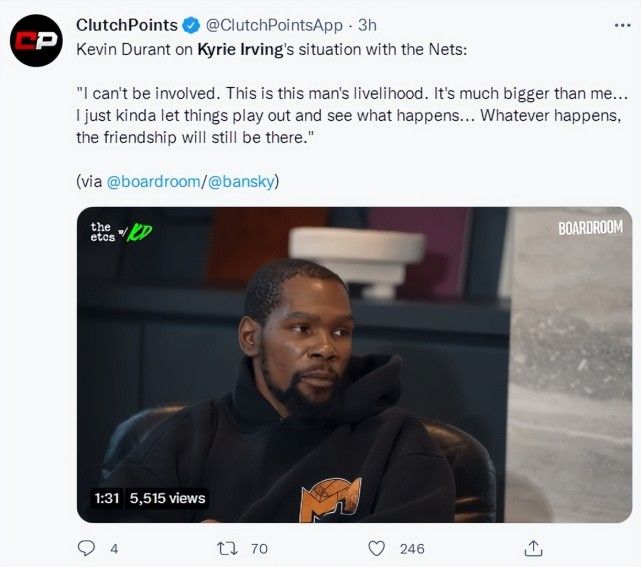 杜兰特最新的采访也提到:欧文与篮网的谈判自己不会参与,因为那是欧文的个人生计问题。
