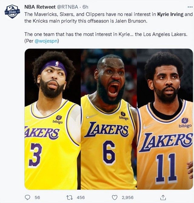 随后沃神还表示:欧文拿不到篮网的长约顶薪,对欧文最感兴趣的是湖人,而他们不存在任何的签换交易,下周欧文大概率会跳出合同,欧文加盟湖人的方式就是640万的中产,明年夏天威少合同到期湖人可以给他足够的钱弥补今年的薪水。