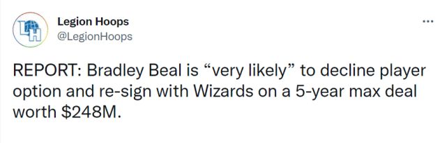 名记沃纳罗斯基报道,比尔很有可能拒绝3640万美元的球员选项,然后与奇才以5年2.48亿美元的超级顶薪合同重新签约。2021-22赛季,比尔因伤只打了40场比赛,场均23.2分4.7篮板6.6助攻。此前多支球队对比尔感兴趣,现在看来,他很有可能继续留在奇才了。