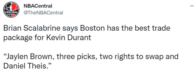 被称为“白曼巴”的斯卡拉布莱恩表示,波士顿凯尔特人拥有交易杜兰特的最佳筹码。“杰伦-布朗、泰斯、三个首轮和两个首轮互换权,”这就是斯卡拉布莱恩提出的潜在报价组合。