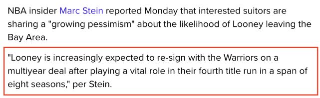 最后需要谈及的是,据美媒马克-斯坦的说法,在今年休赛期对勇士内线悍将凯文-卢尼感兴趣的球队“越来越悲观”: