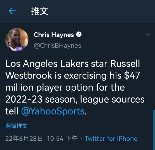 没有悬念,威少未来很难拿到超级顶薪合同,因而根据Woj、Chris Haynes等多位名记报道,威少已经确认将执行剩余一年的4710万美金球员选项,下赛季回归湖人,而威少的经纪人Thad Foucher将于美国时间今日提交相关文件。