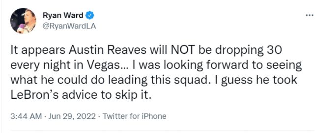 上赛季效力湖人的里夫斯并不在夏联名单上。湖人记者Ryan Ward表示:“看不到里夫斯在拉斯维加斯每场轰下30分了……我原本还期待看他如何领导这套阵容,我猜测他听取了勒布朗的建议,决定不打夏联。”里夫斯上赛季为湖人出战61场,场均7.3分3.2篮板1.8助攻。
