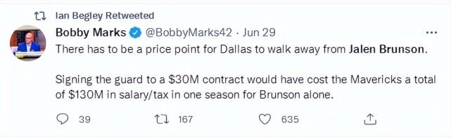 薪资结构专家鲍比-马克斯分析,独行侠放弃布伦森肯定是有一定代价的,如果独行侠给了均薪超过3000万的合同,那么仅布伦森一人独行侠就要支付薪水+奢侈税1.3亿美元。