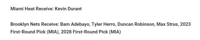 北京时间7月1日,杜兰特正式向篮网提出交易申请,希望加盟太阳或者热火。KD的合同还有4年,篮网未必会遵照杜兰特的意愿,但如果太阳和热火真想得到杜兰特,他们要付出怎样的筹码呢?美媒Fadeaway World晒出了两笔相关的交易方案——