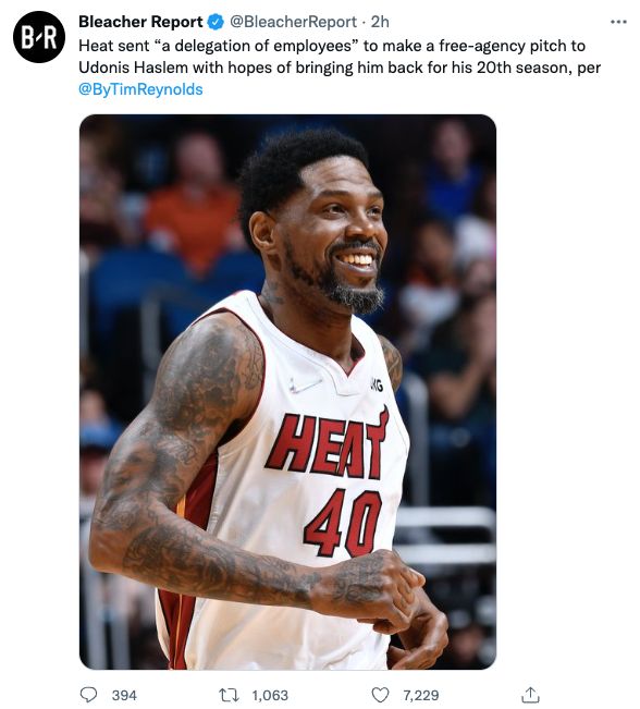 根据热火记者Tim Reynolds报道,“为展示这个男人对球队持续的重要性和价值,热火已经派出一个员工团队,在今晚6点第一时间找到哈斯勒姆展开游说工作,希望能吸引他回归球队,并在下赛季开启他在热火的第20个赛季。”