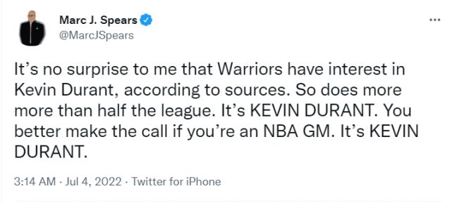 名记Marc:勇士也杜兰特感兴趣不感到意外