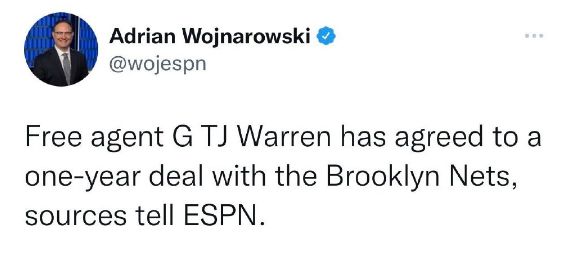 北京时间7月5日,“湖人有意队”又没戏了,根据名记Shams报道,篮网用一年合同签约自由球员TJ-沃伦,而他过去两个赛季因为左脚应力性骨折,仅仅只打了4场比赛。