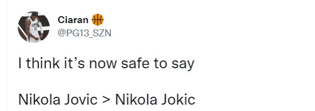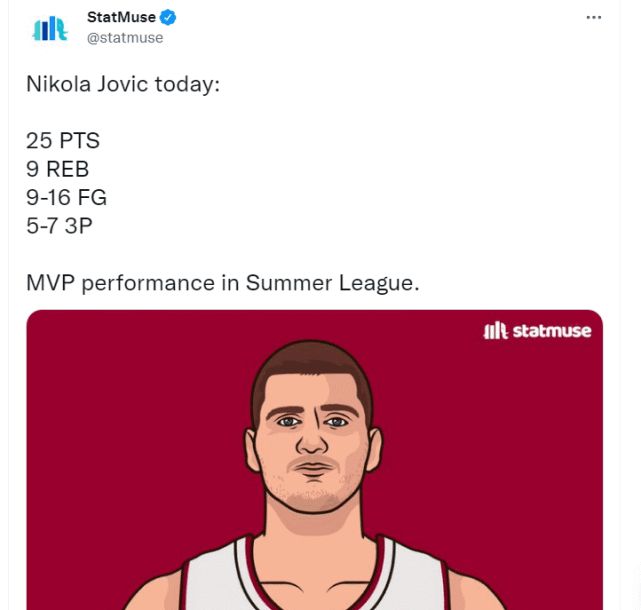 约维奇在这场比赛中展现了柔和的投篮手感,多次在外线出手命中,背身单打后的金鸡独立,也让人想起了昔日的诺天王,不少球迷在社媒上调侃:“约维奇比约基奇还猛!”美媒StatMuse晒出了约维奇的本场数据,然后配上了一张约基奇的卡通图,还写道:“夏季联赛的MVP表现。”