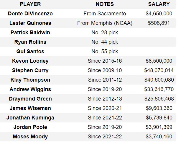 北京时间7月6日,勇士官方宣布,正式用双方合同签下孟菲斯大学的射手莱斯特-基诺内斯。如今,勇士的最新14人名单已经出炉。2021-22赛季,勇士拿下总冠军,新赛季,库里将率领球队力争卫冕。