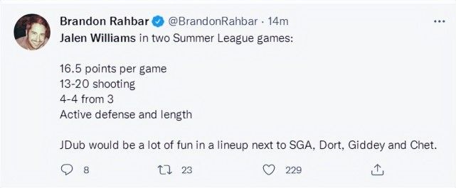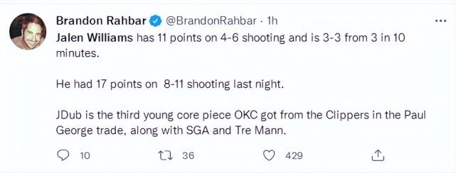 雷霆记者Brandon Rahbar写道:杰伦-威廉姆斯是雷霆与快船交易保罗-乔治变现的第三位雷霆未来核心,前两位是亚历山大与特雷-曼。