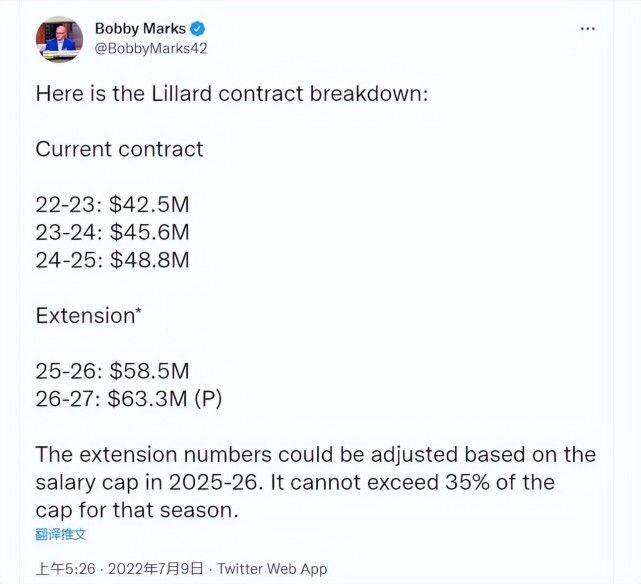 利拉德又和开拓者续约了,他留在开拓者意味着基本上不能冲冠,不过他赚得盆满钵满。鲍比·马克斯列出了利拉德续约两年的薪金明细——2025-26赛季:5850万美元,2026-27赛季:6330万美元。利拉德还拥有最后一年的球员选项,球队对他真的很好。利拉德现有合同金额——2022-23赛季:4250万美元,2023-24赛季:4560万美元。2024-25赛季:4880万美元。