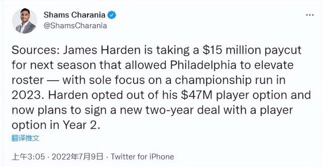 这一天,哈登的合同也公布出来,根据查拉尼亚的报道,哈登将和76人签下1+1合同,新赛季的薪水大约3240万美金,而哈登放弃执行的薪水达到4740万美元。