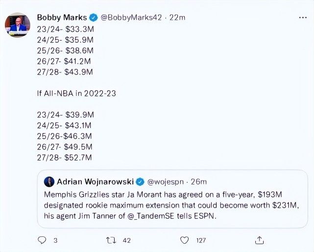 5年1.93亿的合同将在2023年夏生效,第一年3325万、第二年3591万、第三年3857万、第四年4123万,第五年4389万。