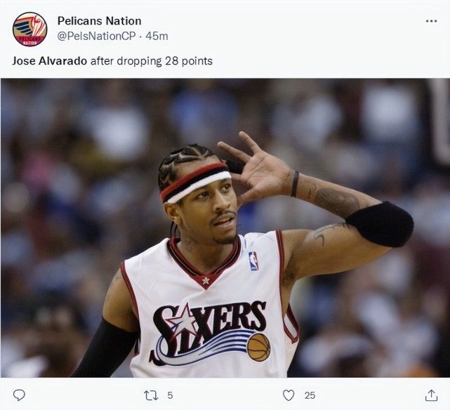 鹈鹕媒体甚至上传艾弗森的图片写道:阿尔瓦拉多拿下了28分。1.83米的顶级得分手历史上只有艾弗森一人,阿尔瓦拉多的天赋跟答案差距很大,可他能拿下职业生涯第二高分真的不容易。