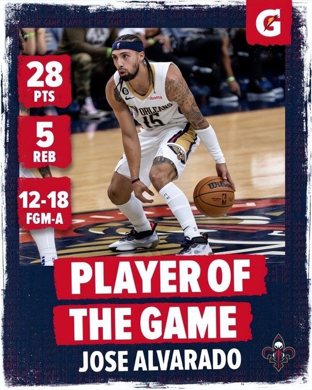 鹈鹕官方都制图上传了阿尔瓦拉多的数据,全场比赛24分钟,18中12,三分5中2,拿下28分5篮板1助攻1抢断,命中率66.7%,作为一名1.83米的后卫此役阿尔瓦拉多效率逆天。