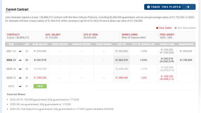 阿尔瓦拉多今年23岁,他在2021年参选NBA落选后与鹈鹕签下一份双向合同,因为表现优异被鹈鹕队转为4年650万的新秀合同,上赛季他的年薪为150万美元,代表鹈鹕出战54场比赛,场均15.4分钟,拿下6.1分2.8助攻1.34抢断,命中率45%,三分命中率29%。