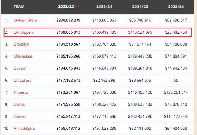 快船本赛季现有阵容的薪金总额达到了1.99亿美元,创造了队史薪金总额新高,在NBA历史上也排名第二,只落后本赛季薪金总额达到2亿美金的勇士。快船兵强马壮,本赛季的唯一目标就是总冠军。