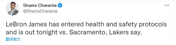 根据名记shams报道,詹姆斯进入健康安全协议,除非两次检测为阴性,不然至少缺席10场比赛